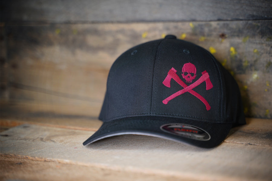 Skull and axes on front left, Stay the Course Crafted logo on rear center of hat
